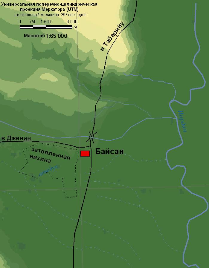 Основные силы мусульман шли от Дамаска по дороге на Иордан. Около Тивериадского озера от них отделился отряд, который осадил Табарийу (Тивериаду), служа одновременно прикрытием с севера. Византийцы, чтобы стеснить действия мусульманской конницы, затопили низину в районе Байсана141 (рис. 3). Дальше мы сталкиваемся с двумя версиями событий. Одни источники говорят о том, что мусульмане разгромили византийцев у Фихля, а затем, преследуя беглецов, наткнулись на заболоченный участок и еле выбрались из него142. Согласно другим, первое столкновение произошло под Байсаном, а затем началось противостояние под Фихлем, сопровождавшееся мелкими стычками конных отрядов. Решительное сражение, по их данным, также произошло под Фихлем143, однако ал-Азди, дающий наибольший объем сведений об этих событиях, не упоминает топи, которая препятствовала бы коннице преследовать беглецов.