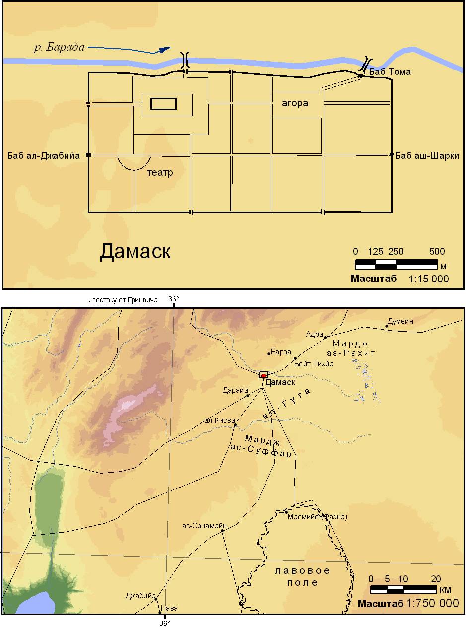 После поражения византийцев на Иордане жители Фихля поспешили заключить договор с победителями, обязавшись в обмен на гарантию неприкосновенности жизни и имущества платить джизью; греки (румы) могли в течение года беспрепятственно покинуть страну, а оставшись, тоже обязывались платить джизью147. Не стали испытывать судьбу и жители Табарии, также заключив договор. Видимо, тогда же решилась судьба остальных городков по Иордану и вокруг Тивериадского озера. В конце февраля соединенная мусульманская армия снова двинулась на Дамаск. I мухаррама 14/25 февраля 635 г. на равнине Мардж ас-Суффар путь ей преградили крупные силы византийской армии, состоявшей из остатков армии, разгромленной под Фихлем, гарнизона Дамаска и подкреплений из Химса. Подробности этого сражения неизвестны. Сообщается только, что в нем погиб незадачливый полководец Халид б. Са́йд и будто бы было ранено 4000 мусульман148, о численности противника и его потерях не сообщается. Отчасти недостаток прямых сведений у ал-Балазури можно восполнить за счет сообщений, которые, скорее всего, связаны с этой битвой, но ошибочно отнесены компиляторами к более раннему времени. Так, согласно ал-Мадаини, битва в указанной местности, в которой пал Халид б. Са́ид, произошла в первый месяц вторжения, но несомненно, что ал-Балазури говорит о ней же; в битве участвовало 4000 византийцев под командованием друнагария149, у ал-Балазури это число превратилось в число раненых мусульман. Возможно, что битва в Мардж ас-Суффар, которую ал-Куфи связывает с возвращением из Аджнадайна 150, также относится к зиме 634/35 г. То же можно сказать и о сообщении ал-Азди, у которого битва перед Дамаском также идет вслед за Аджнадайном; по его данным, друнагарий пришел с пятитысячным войском, к которому присоединилось столько же добровольцев из Дамаска и Химса, в сражении погибло 500 из них и еще 500 было убито и взято в плен во время преследования151. Но против этого говорит то, что последних два автора не упоминают гибели Халида б. Са́ида и его участия в битве.