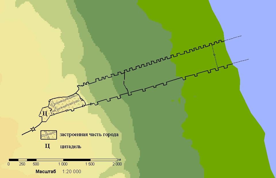 Кайсарийа действительно была большим городом, который тянулся вдоль моря на расстоянии четырех с половиной километров. На северном конце его находилась часть, окруженная крепостной стеной, примерно такой же величины, как Дамаск или Иерусалим. С севера внутрь укрепленной части города под стеной входили два водовода633 (рис. 14). Число его постоянных жителей было около 50 – 70 тысяч.