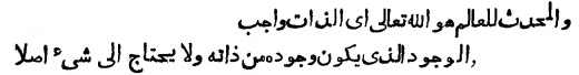 единое. Он – безначальный (араб.), живой, всемогущий, всеведущий, слышащий, видящий, желающий. Он не есть ни свойство, ни тело, ни атом; Он не подлежит изображению, определению, исчислению; не разделим, не сложен, не имеет предела; не описываются сущностию или качеством