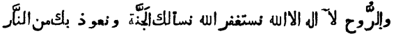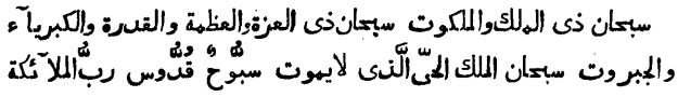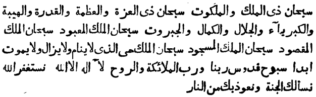 „Да будет славен Тот, который владеет царями и царствами! Да будет славен Тот, который владеет превосходством, величием, силою, высотою и могуществом! Да будет славен Царь, вечно живущий, Тот, который никогда не умирает! Достославный, Святой, Владыка ангелов и Духа! Нет бога, кроме Аллаха. Аллаха молим мы о прощении; у Тебя испрашиваем рай и к Тебе бежим от адского пламени»!
