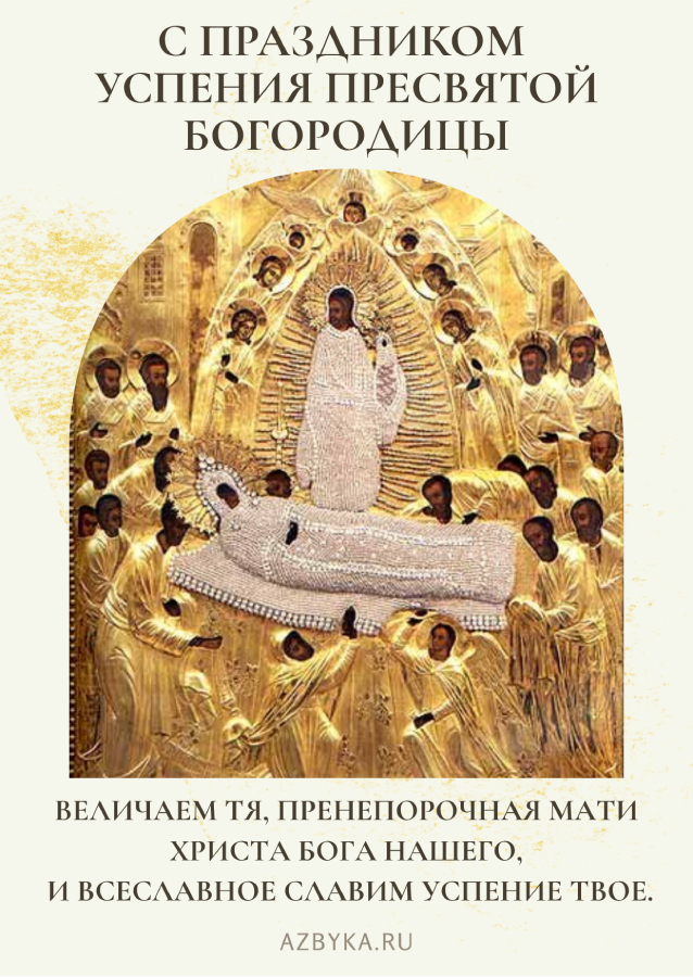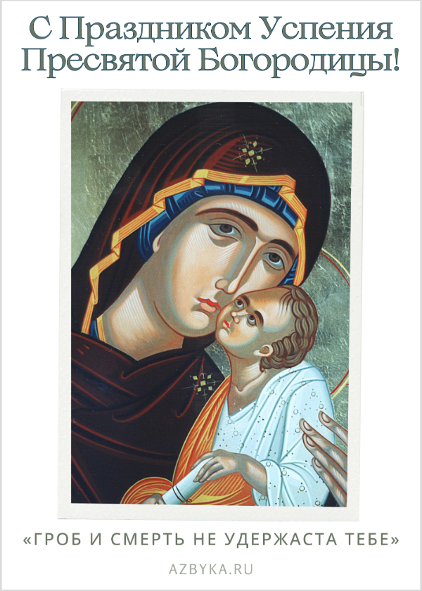 Открытки на праздник Успения Пресвятой Богородицы Просим учесть, что открытка является лишь иллюстрацией к поздравлению или приветствию. Отправлять открытку без личных слов – неуважение к собеседнику. Рекомендуемые статьи Ноты для хора: Успение Пресвятой БогородицыТест: Успение Пресвятой Богородицы
