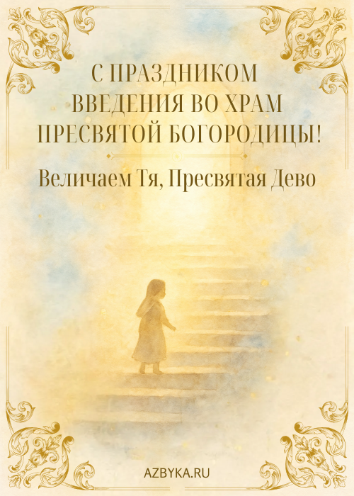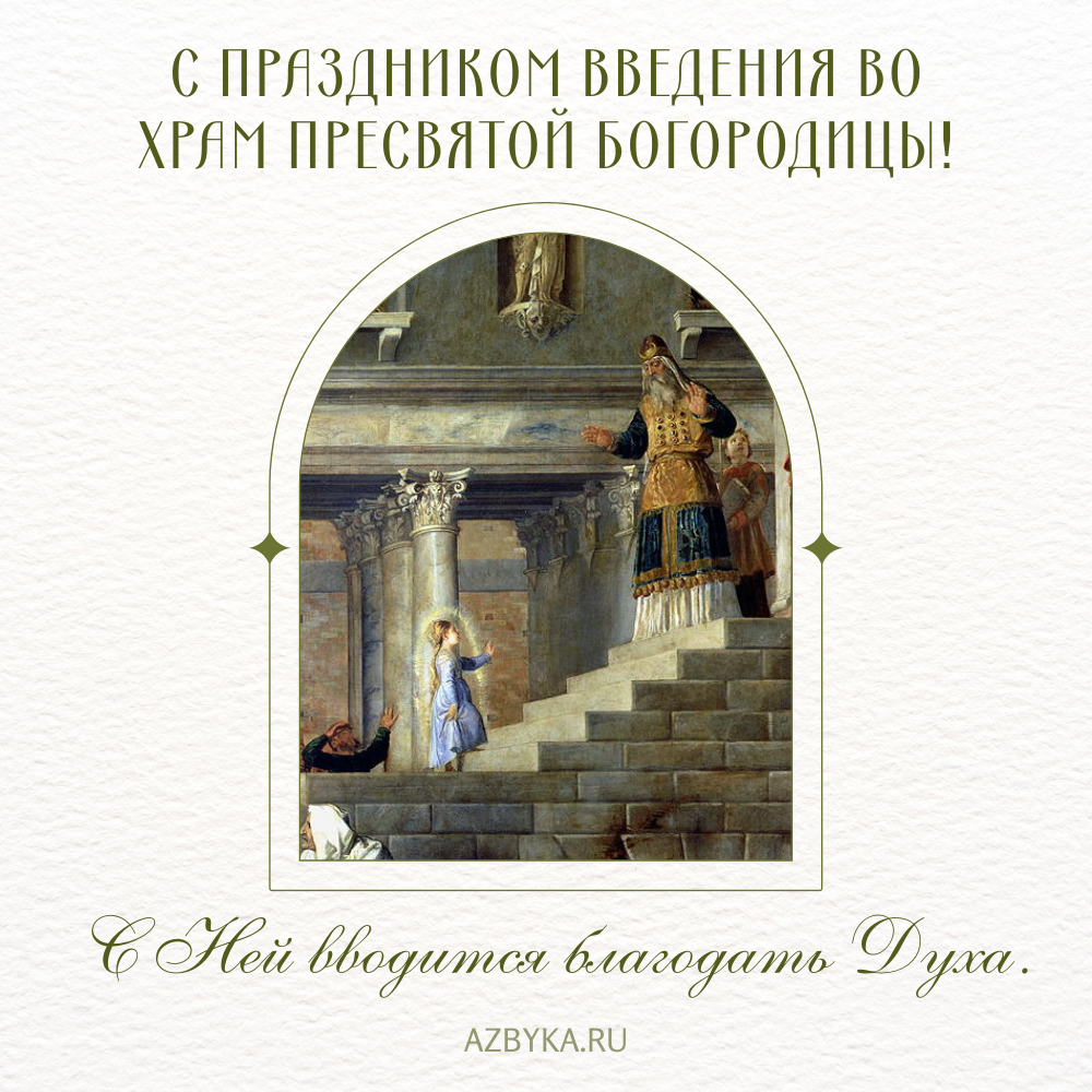 Открытки на Введение во Храм Пресвятой Богородицы Просим учесть, что открытка является лишь иллюстрацией к поздравлению или приветствию. Отправлять открытку без личных слов – неуважение к собеседнику.