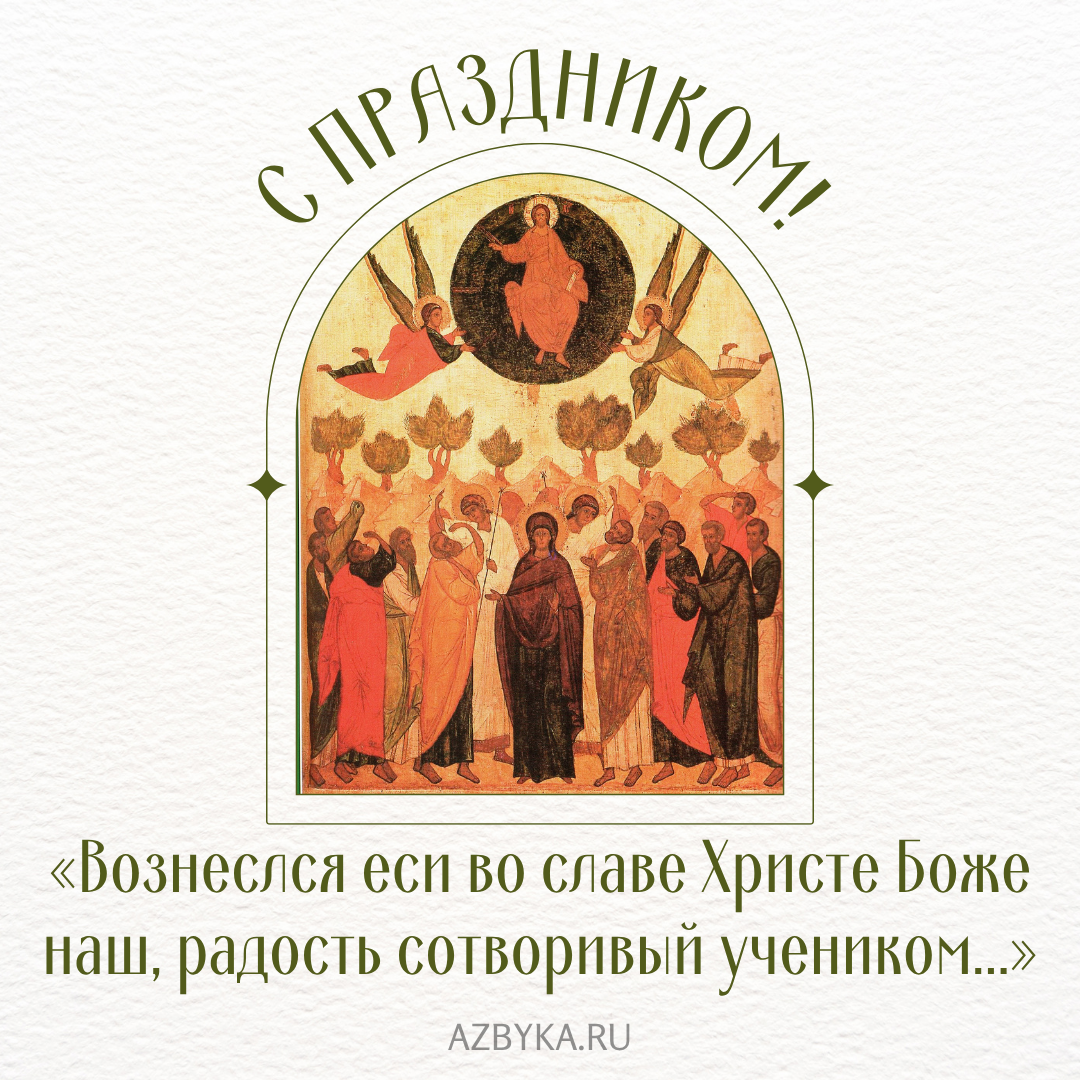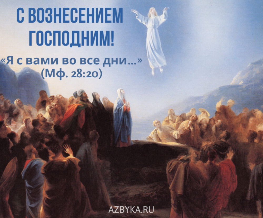 Открытки ко дню Вознесения Господня Просим учесть, что открытка является лишь иллюстрацией к поздравлению или приветствию. Отправлять открытку без личных слов – неуважение к собеседнику. Рекомендуемые статьи Вознесение Господне Православный календарьВознесение Богословско-литургический словарьВоскресение Господа и явления Его ученикам по воскресении И. ГлебовНоты для хора: Вознесение ГосподнеТест: Вознесение Господне