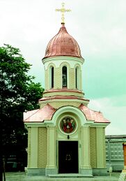 Храм-часовня Архистратига Михаила при Северо-западном Управлении Внутренних дел на транспорте (Санкт-Петербург). Часовня с позолоченным крестом на шлемовидном куполе построена в 2001 году всего за три месяца.