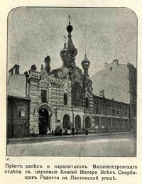 22 августа 1899 года по проекту инженера Петра Майера был заложен каменный корпус приюта для детей. На втором этаже, посредине нового корпуса, отделанного изразцовым кирпичом и украшенного пятью главками, епископ Нарвский Иннокентий 7 февраля 1902 года освятил церковь на 400 человек с одноярусным иконостасом во имя иконы Божией Матери "Всех скорбящих Радость". Приют стал именоваться Домом общества попечения о бедных и больных детях. Царские врата, боковые двери, стены и потолок были расписаны детьми. В 1919 году храм стал приходским (приписанным к церкви святого апостола Матфия, Покровская церковь). 23 ноября 1927 года храм закрыли, интерьеры уничтожили, здание перешло к Дому физически дефективных детей и позднее подверглось перестройке. В 1929 году фасад лишился декора и получил обработку в духе классицизма, было утрачено и завершение церкви в виде барабана с луковкой. Здание принадлежит Научно-исследовательскому детскому ортопедическому институту.