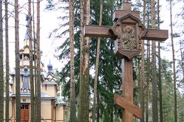 - Поклонный Крест при входе в обитель в память новомучеников, протоиерея Николая Ивановича Меринова, расстрелянного и похороненного на Левашовской Пустоши