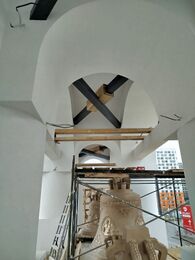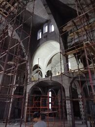 В настоящее время идет отделка цоколя гранитом, внутри храма накладывается сетка под штукатурку и штукатурится. В доме причта на третьем этаже кладётся чистовой пол, сейчас начинают класть на втором этаже, потом будет первый. Внутри храм будет полностью отделан с полом и дверями к концу мая. Заказан и оплачен без последнего взноса каркас иконостаса и паникадила со светильниками. Будет устанавливаться сразу по окончании внутренних работ.