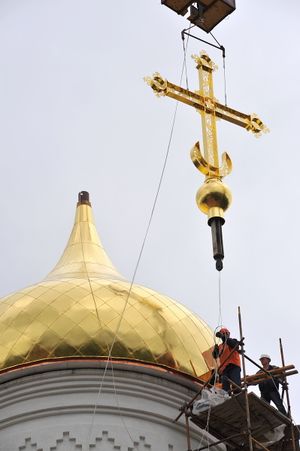 Пока все службы проходят в маленьком деревянном храме в честь Сергия Радонежского.