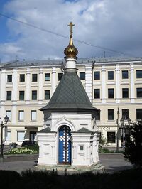 Освящение и устройство часовни. Часовня была освящена 28 ноября 1887 года и приписана к Никольской церкви в Манеже. Она представляет собой чугунный восьмигранник с шатровым верхом, увенчанным короной.