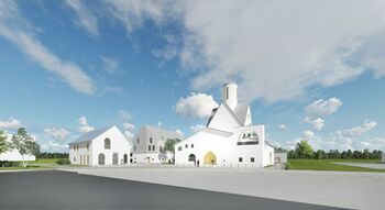 Храм Святителя Тихона Патриарха Московского в Северном Тушине (Москва). Каменная церковь, одноглавый четверик под высокой восьмискатной кровлей, с примыкающими пониженными притвором и северным и южным приделами, начатая строительством в 2020 по проекту арх. Д. Е Макарова.