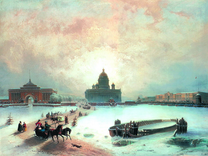 Ледовая дорога по Неве (Художник И.А.Вейс). Вид на Сенатскую площадь, Исаакиевский кафедральный собор, Адмиралтейство и здание Сената и Синода