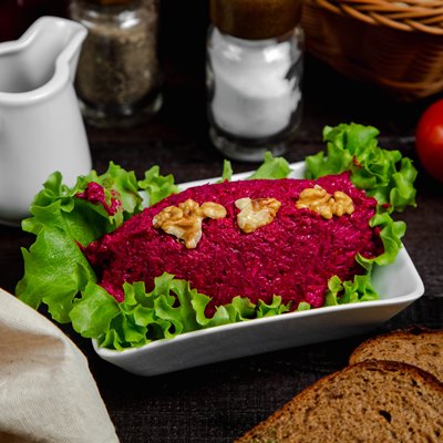 Карп, ядра грецких орехов, лук репчатый, масло растительное, кизил сушёный без косточек, кишмиш, соль.